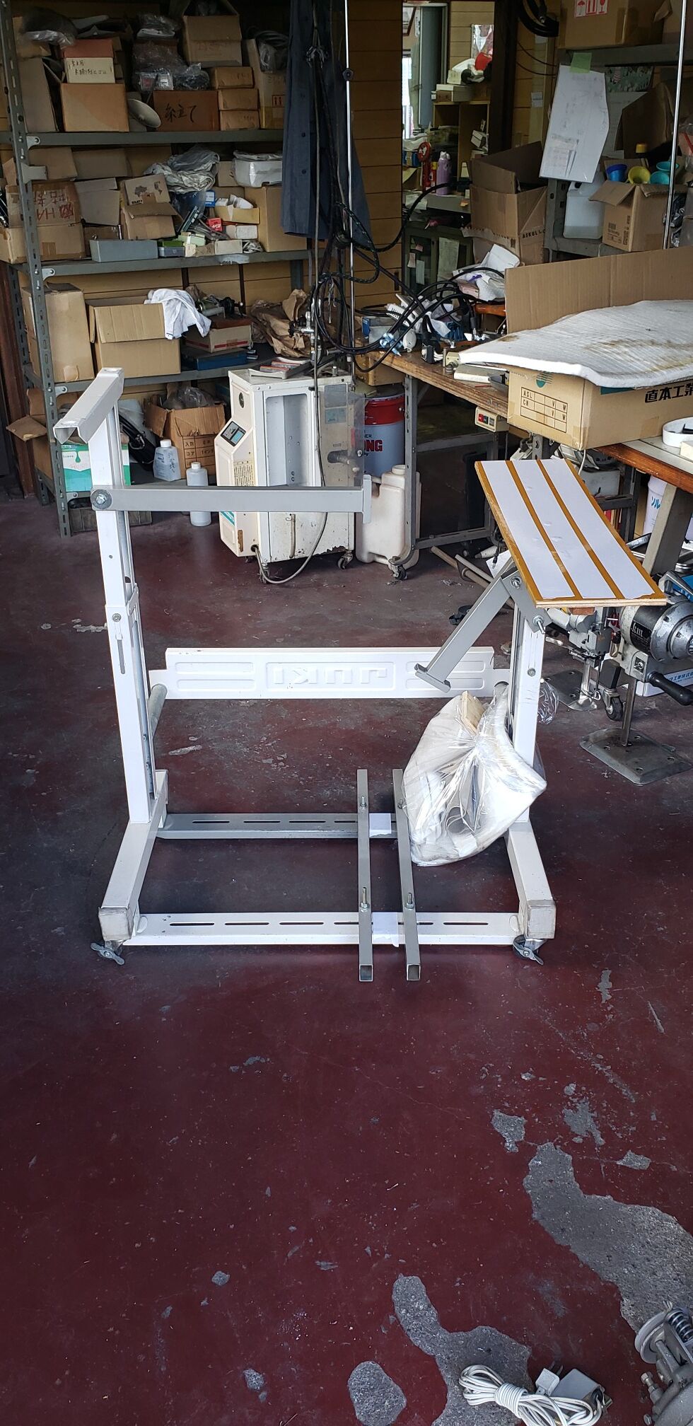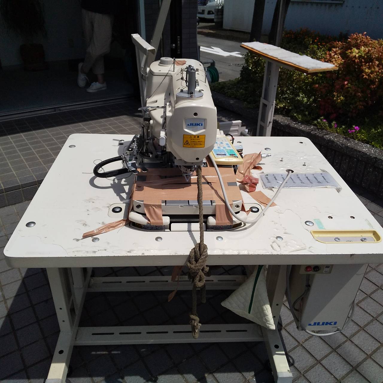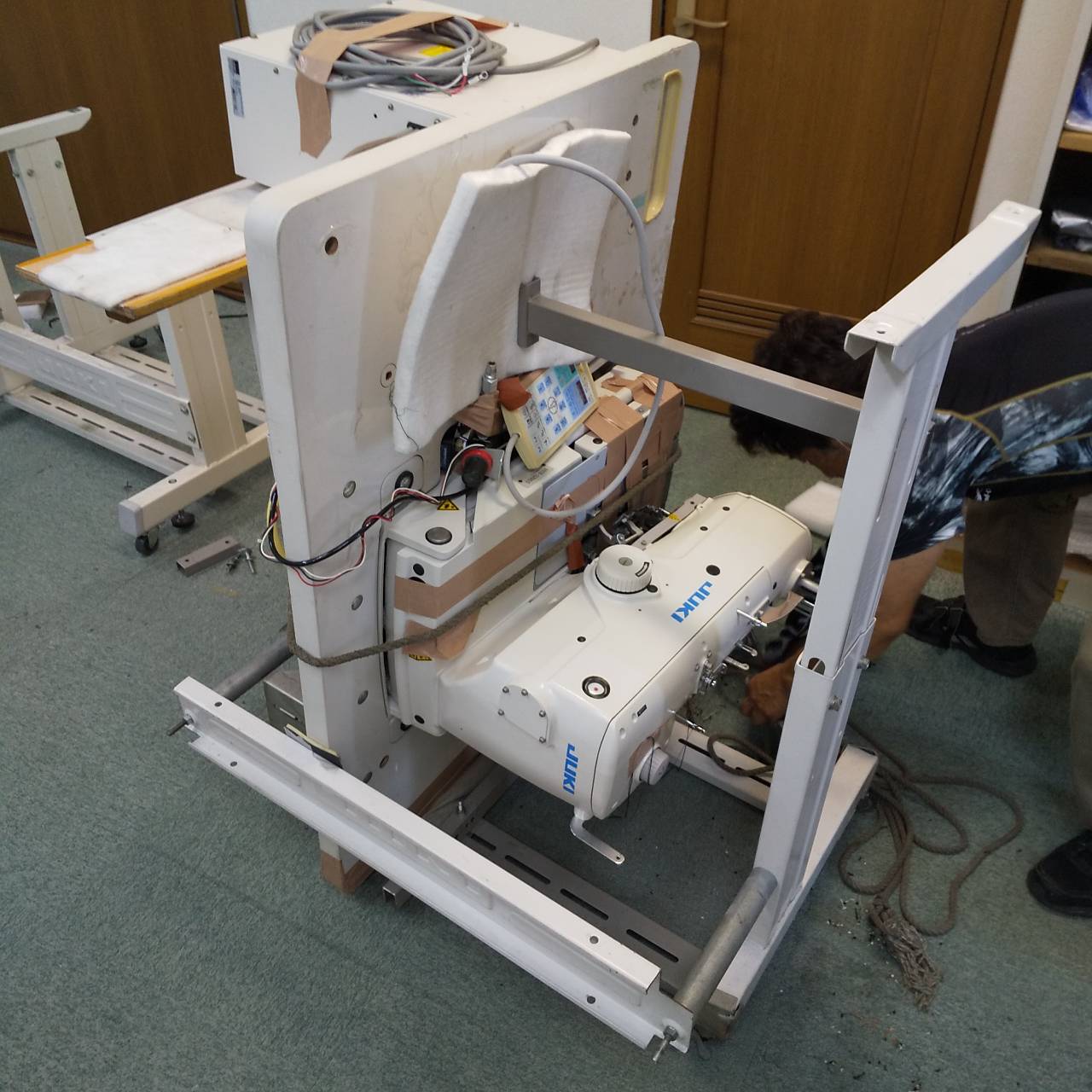 JUKI製MEB-3200(鳩目穴かがりミシン)は、弊社お手製の固定脚に乗せて運び出しました。