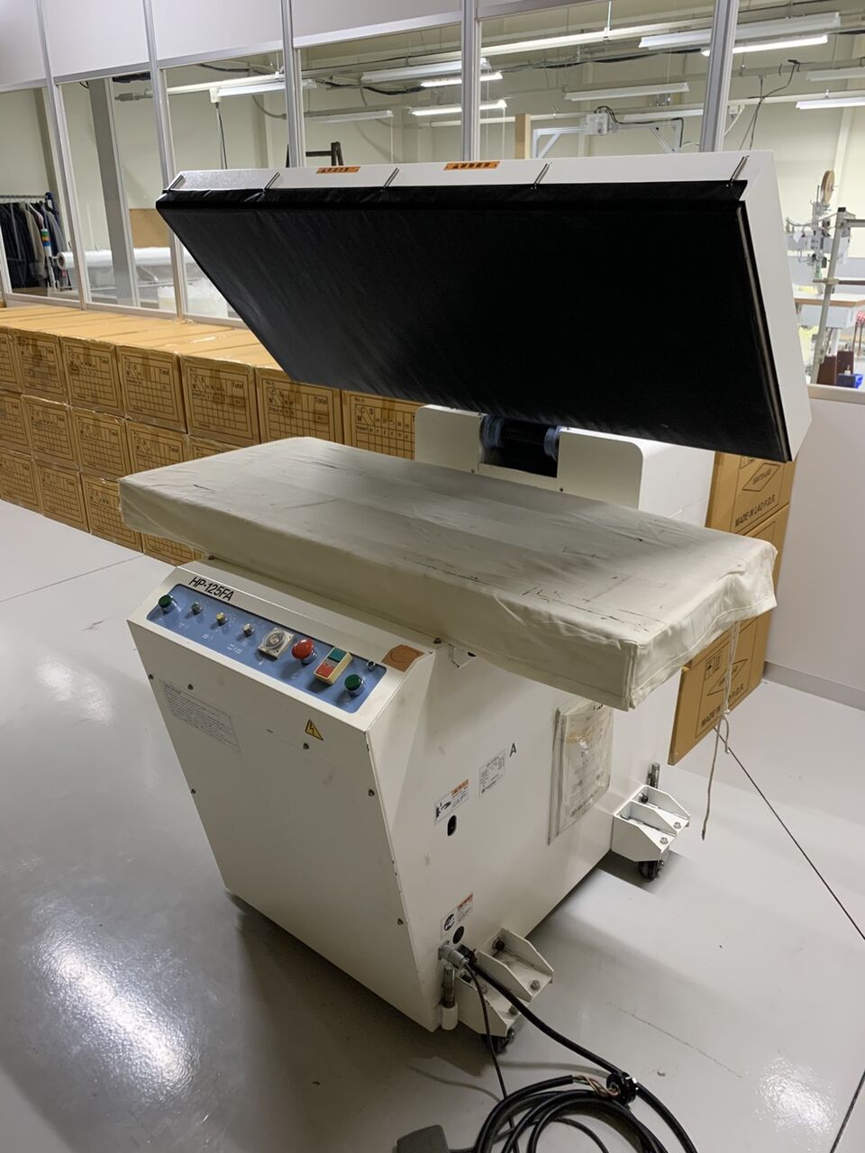 愛知県一宮市の縫製工場様所有のハシマ製HP-125FA(フラット接着機)と
