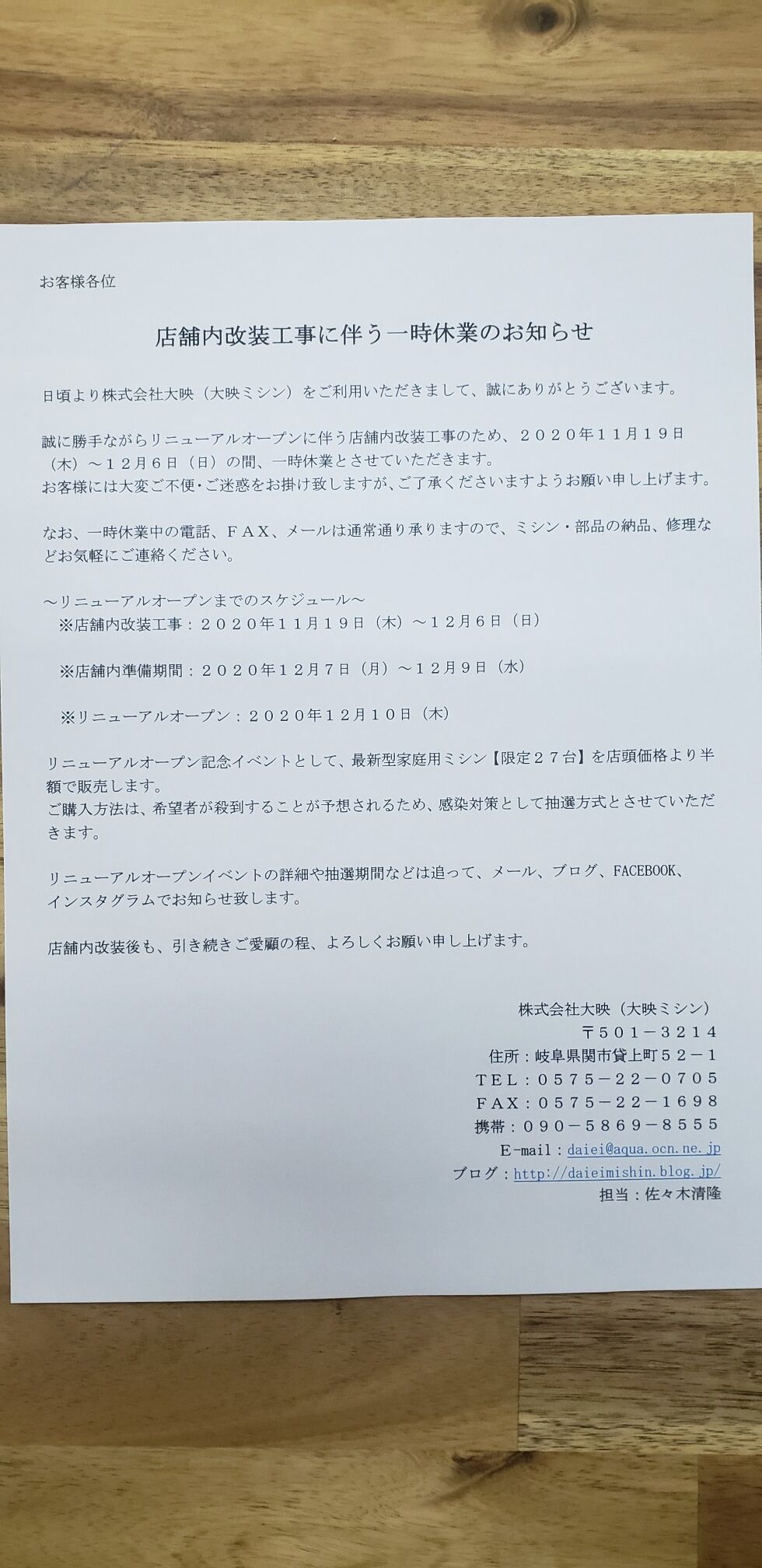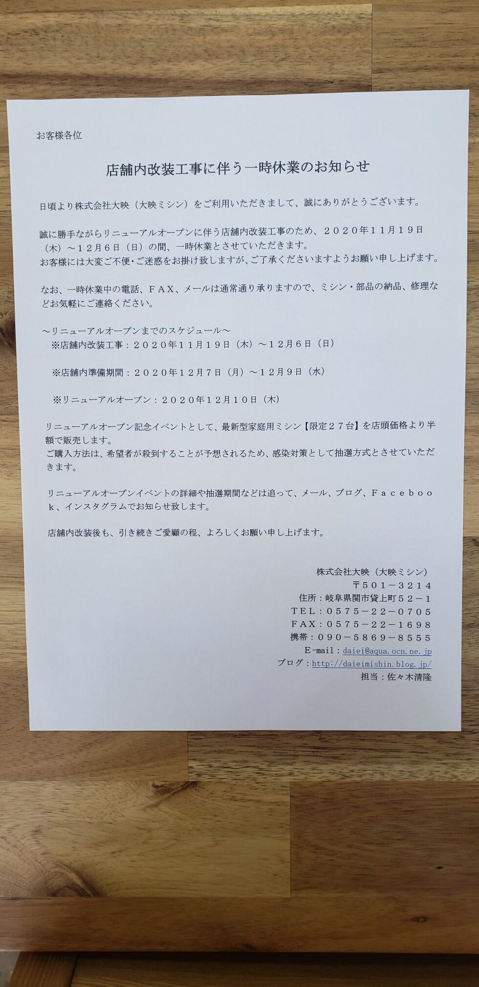 ~店舗内改装工事に伴う一時休業のお知らせ~